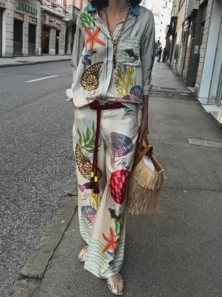 Bohemia Satin Print Loose Two Piece Sets Women Causal Long Sleeve Shirts+Long Wide Leg Pants Female Beach Summer Outfits