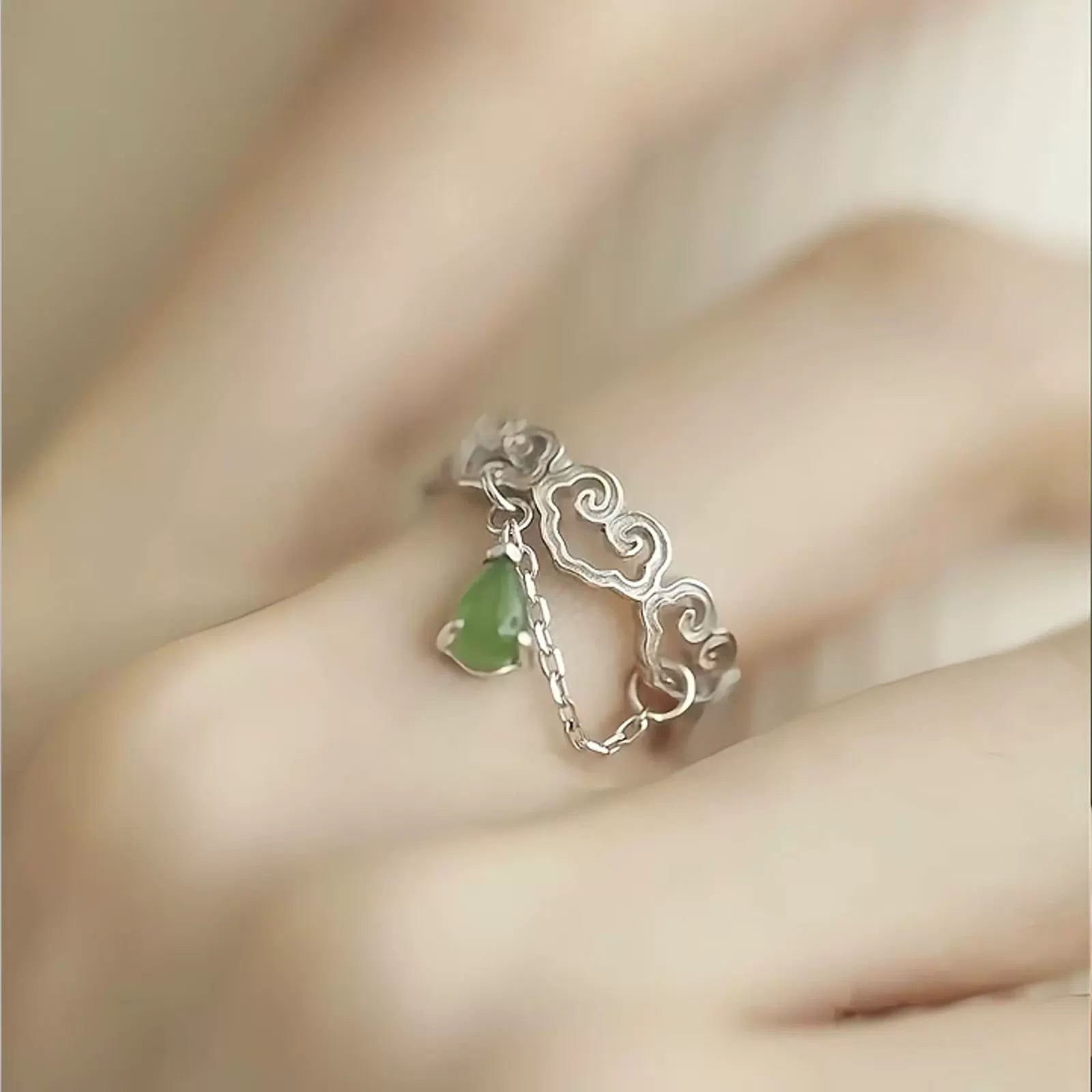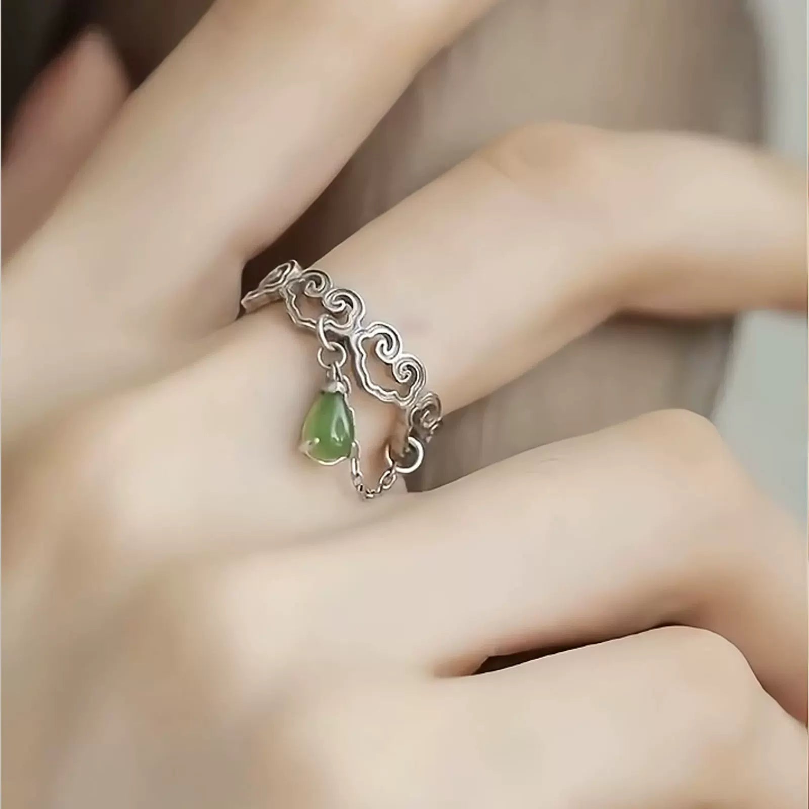 Jasper Water Drop Ring 925 Silver Women's Niche High-end Light Luxury Love Hollow Flower Carving Open Index Finger Ring